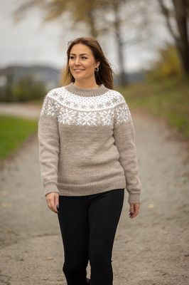 Denne nydelige genseren er strikket i Viking Wool som er et fantastisk flott garn med melerte farger. Et mykt garn i 100 % Highland Merino Wool.Garnet er det perfekte valgetfor dine strikkeprosjekter der du trenger en erstatning og mykere variant av Lett Lopi.